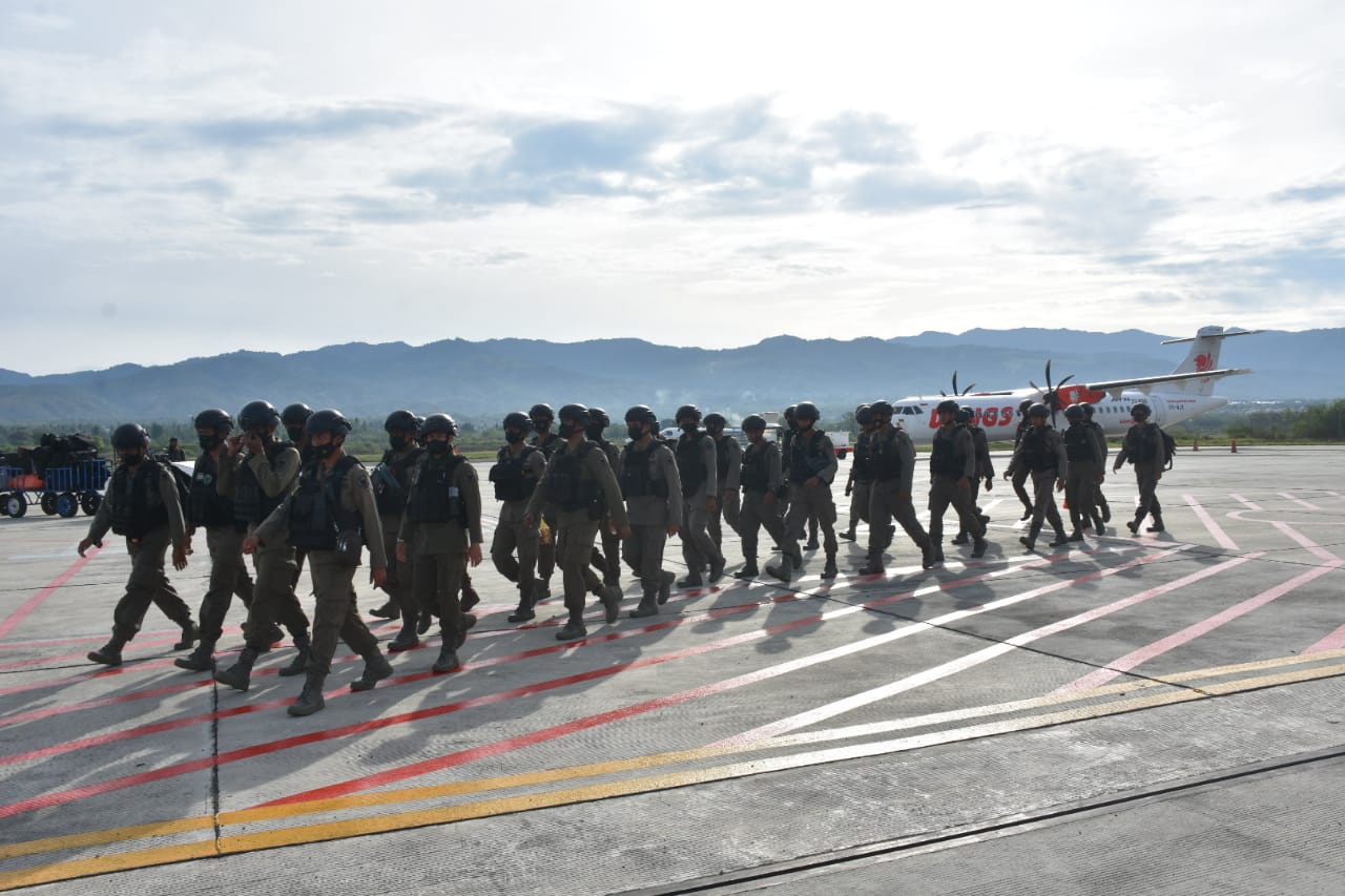 Pagi ini menggunakan pesawat komersial Lion Air, 315 personil Brimob Nusantara telah tiba di Bandara Mutiara Sis Aljufri Palu, Kamis (24/2/2022)