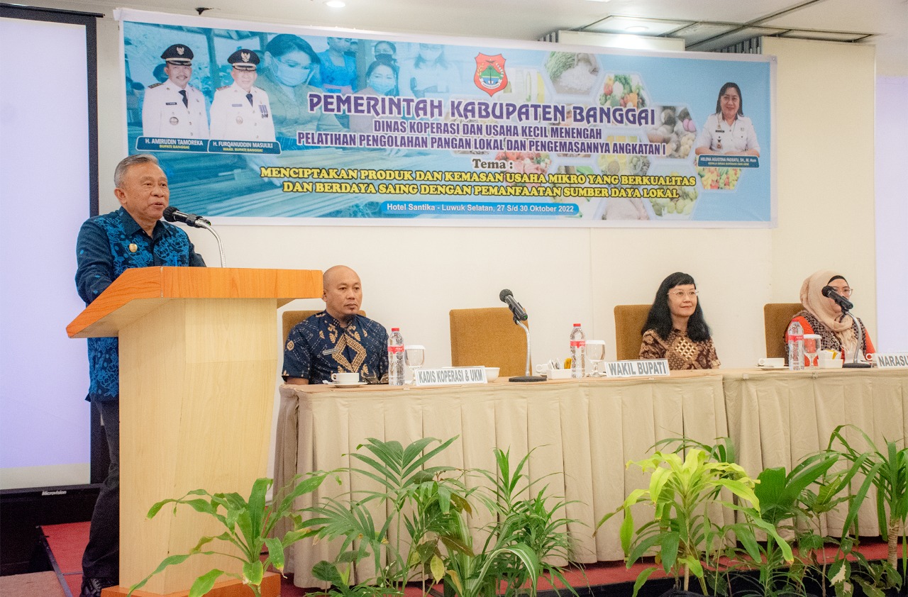 Luwuk.today, Wakil Bupati Banggai Membuka Secara Resmi Acara Pelatihan Pengolahan Pangan Lokal Dan Pengemasannya Angkatan 1, yang diselenggarakan Dinas Koperasi Dan Usaha Kecil Menengah Kab. Banggai, Bertempat di Ballroom Hotel Santika, Kelurahan Tombang Permai Kecamatan Luwuk Selatan, Dengan Tema : Menciptakan Produk Dan Kemasan Usaha Mikro Yang Berkualitas Dan Berdaya Saing Dengan Pemanfaatan Sumber Daya Lokal, Kamis (27/10/2022).