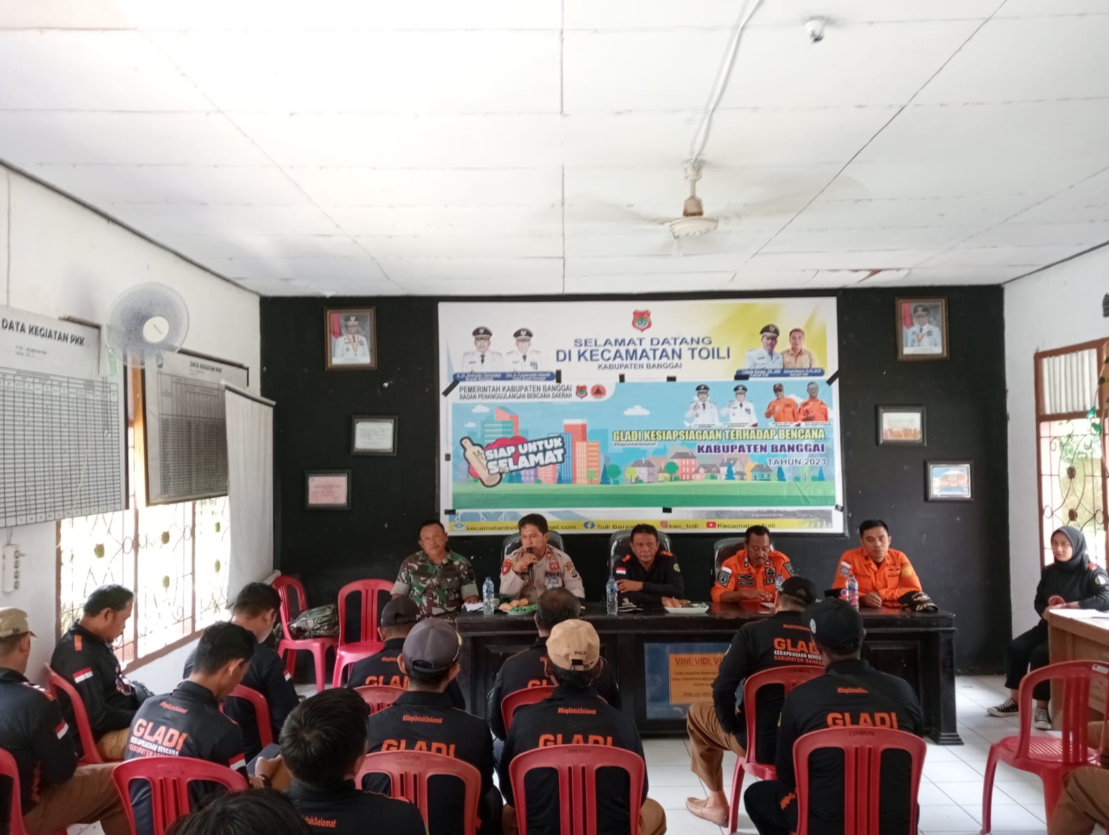 Luwuk.today, Wakapolsek Toili IPTU Velix Damar menghadiri Gladi Kesiapsiagaan terhadap Bencana di Wilayah Kabupaten Banggai tahun 2023, di Aula Kantor Camat Toili, Selasa (17/10/2023) pukul 09.00 Wita.