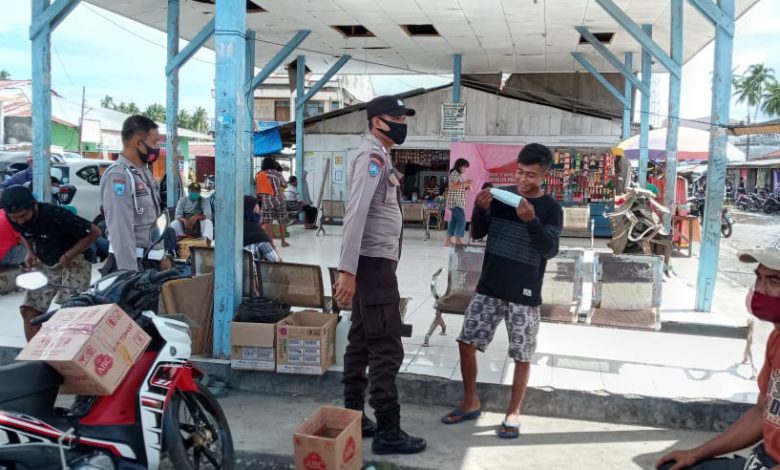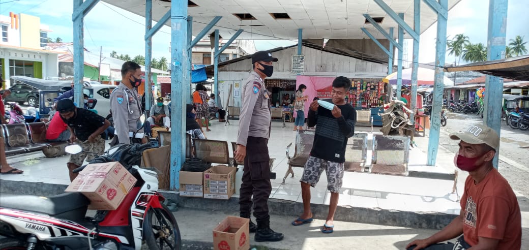 Luwuk Today, Personel Polsek Bunta membagikan masker dan memberikan edukasi protokol kesehatan pencegahan Covid-19 kepada masyarakat dan pedagang di Pasar Kecamatan Bunta, Sabtu (9/1/2021).