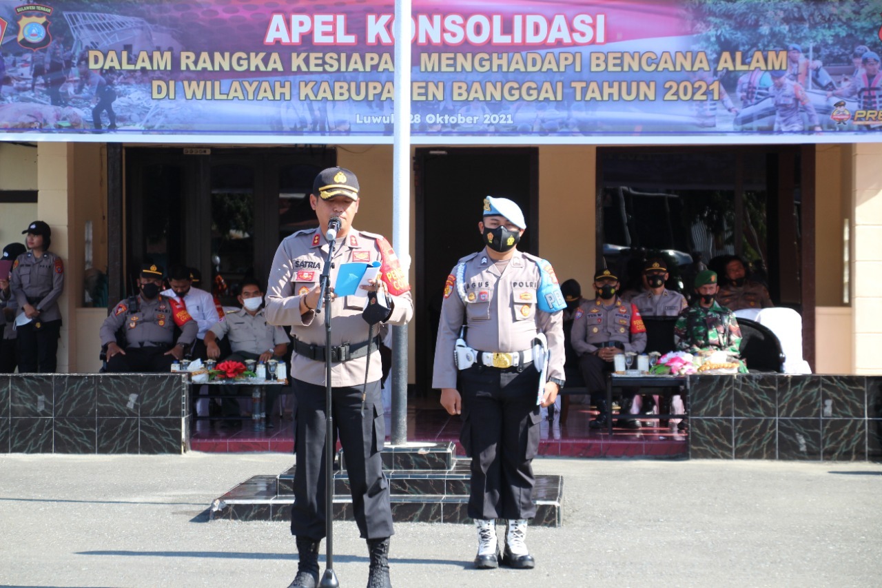 Luwuk.today, Kapolres Banggai AKBP Satria Adrie Vibrianto SIK, MH, memimpin apel konsolidasi dalam rangka kesiapan menghadapi bencana alam di wilayah Kabupaten Banggai Tahun 2021, Kamis (28/10/2021).