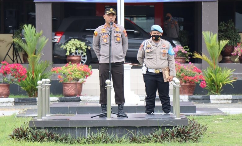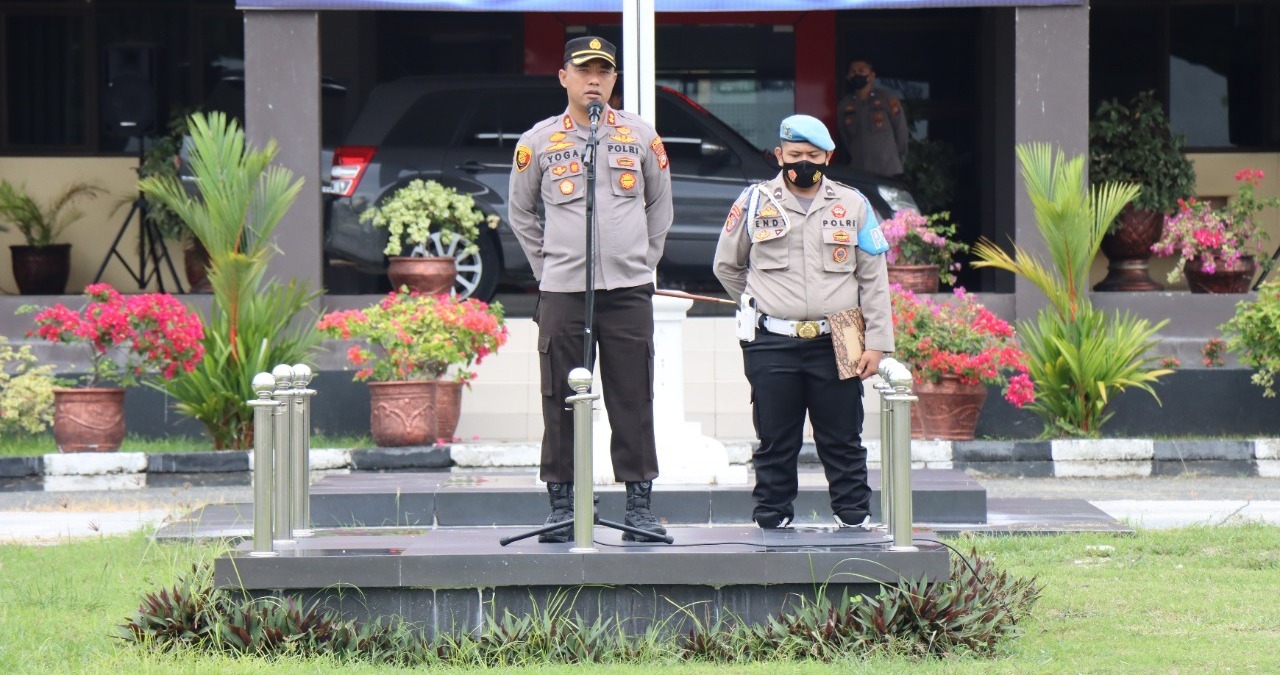 Luwuk.today, Kapolres Banggai AKBP Yoga Priyahutama SH, SIK, MH, memimpin apel pagi dan memberikan arahan kepada seluruh personel di halaman Mapolres Banggai, Senin (21/3/2022).