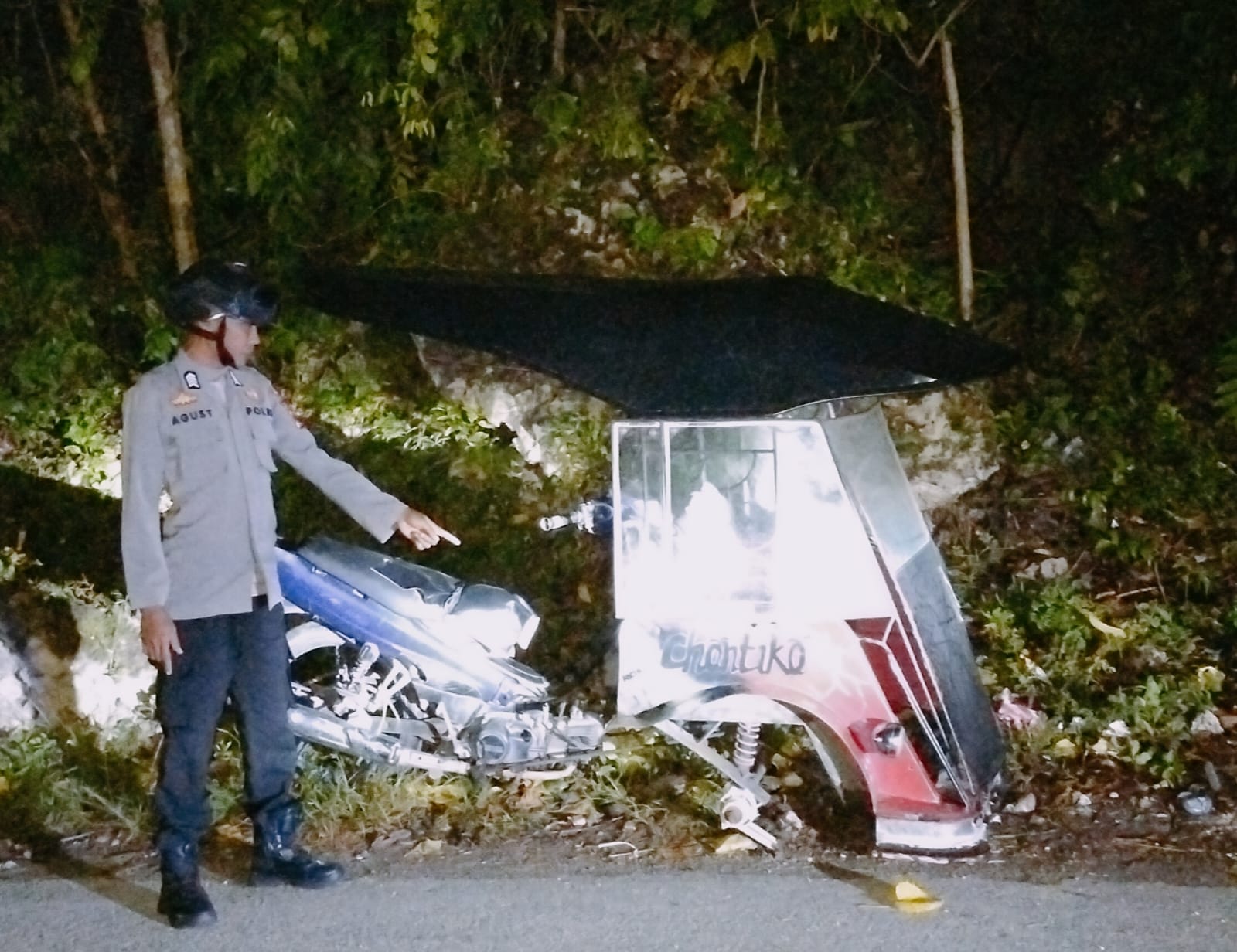 Luwuk.today, Personel Polsek Pagimana mengamankan TKP Kecelakaan Lalu Lintas (Laka Lantas) tabrakan antara sepeda motor kontra Becak Motor (Bentor), Rabu (12/4/2023) malam.