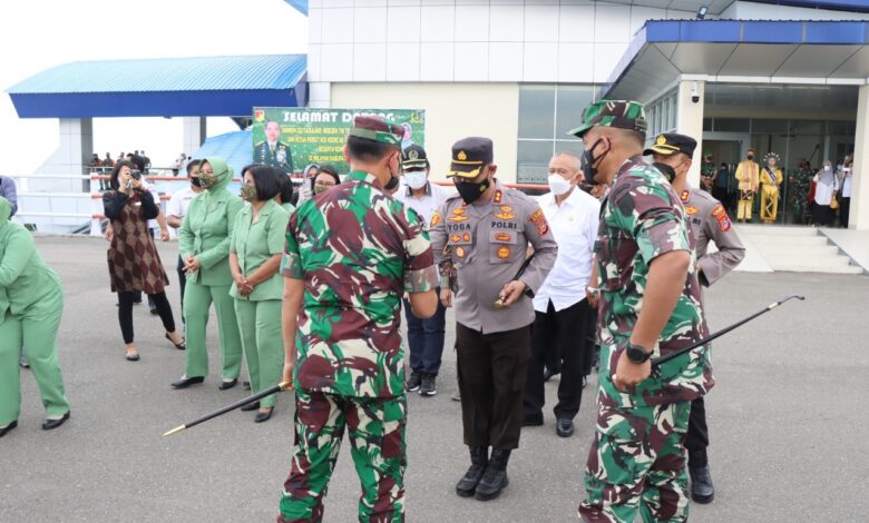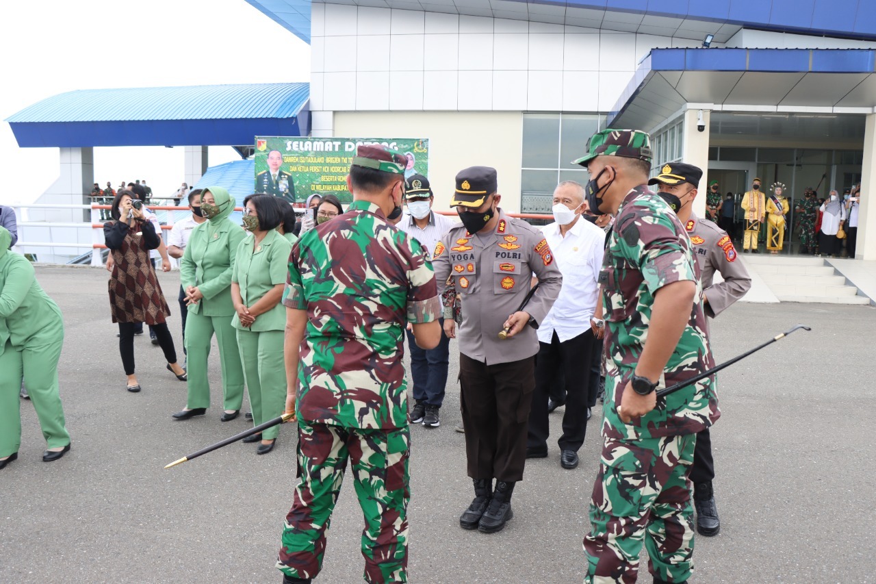 Luwuk.today, Kapolres Banggai AKBP Yoga Priyahutama SH, SIK, MH, menjemput langsung kedatangan Danrem 132/Tadulako Brigjen TNI Toto Nurwanto SIP MSi, di Bandara Syukuran Aminundin Luwuk, Rabu (2/2/2022).