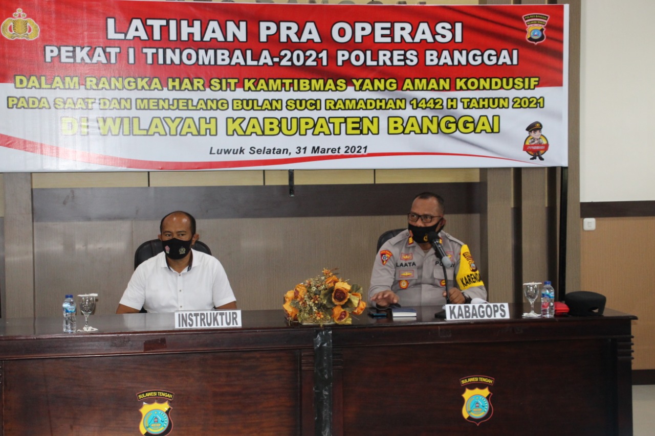 Luwuk.today, Polres Banggai menggelar Latihan Pra Operasi (Lat Pra Ops) dengan sandi Pekat I Tinombala 2021 di Aula Rupatama Mapolres Banggai. Kegiatan itu dibuka oleh Kabagops AKP Laata SH, Rabu (31/3/2021).