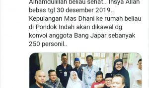 “Insya Allah bebas tanggal 30 Desember 2019.. Kepulangan Mas Dhani ke rumah beliau di Pondok Indah akan dikawal dengan konvoi anggota Bang Japar sebanyak 250 personil,” cuitnya, Senin (23/12/19).