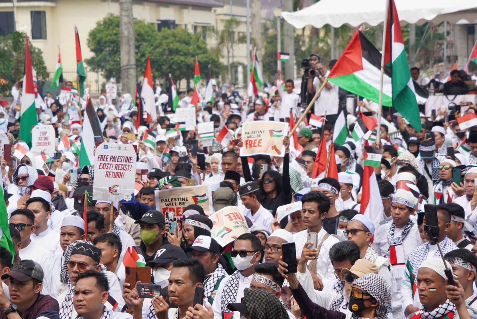 Luwuk.today, PALEMBANG – Forum Masyarakat Sumatera Selatan Peduli Palestina bersama Tokoh, Ulama, Pemerintah dan seluruh elemen masyarakat mengadakan aksi bela Palestina yang dihadiri ribuan massa dari berbagai wilayah, di Lapangan DPRD Provinsi Sumatera Selatan, Ahad (12/11/2023).
