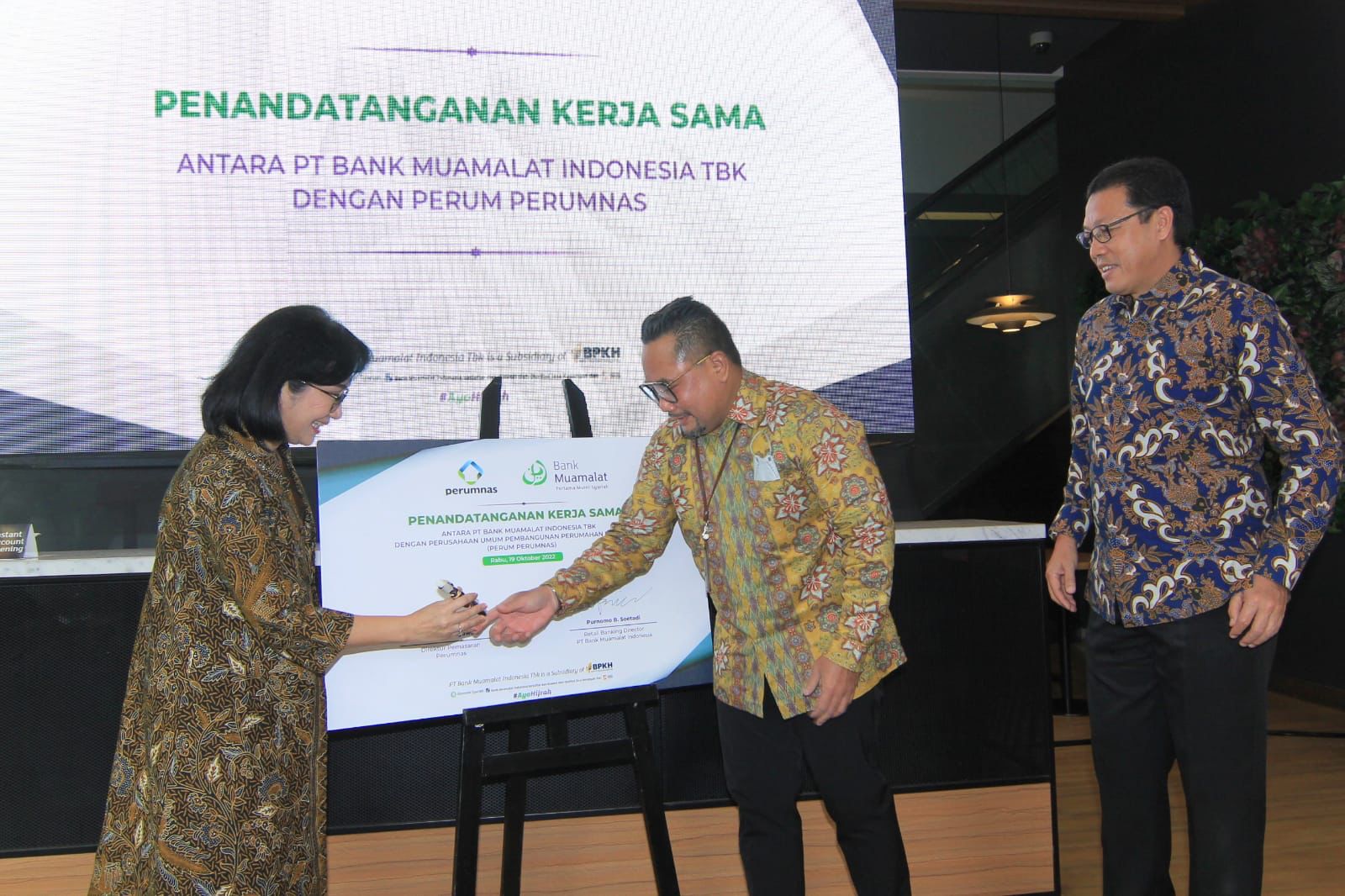 Seremoni penandatanganan Perjanjian Kerja Sama (PKS) antara Bank Muamalat dengan Perumnas dilaksanakan pada Rabu, 19 Oktober 2022 yang dihadiri oleh Direktur Bisnis Ritel Bank Muamalat Purnomo B. Soetadi dan Direktur Pemasaran Perumnas Tambok Setyawati.
