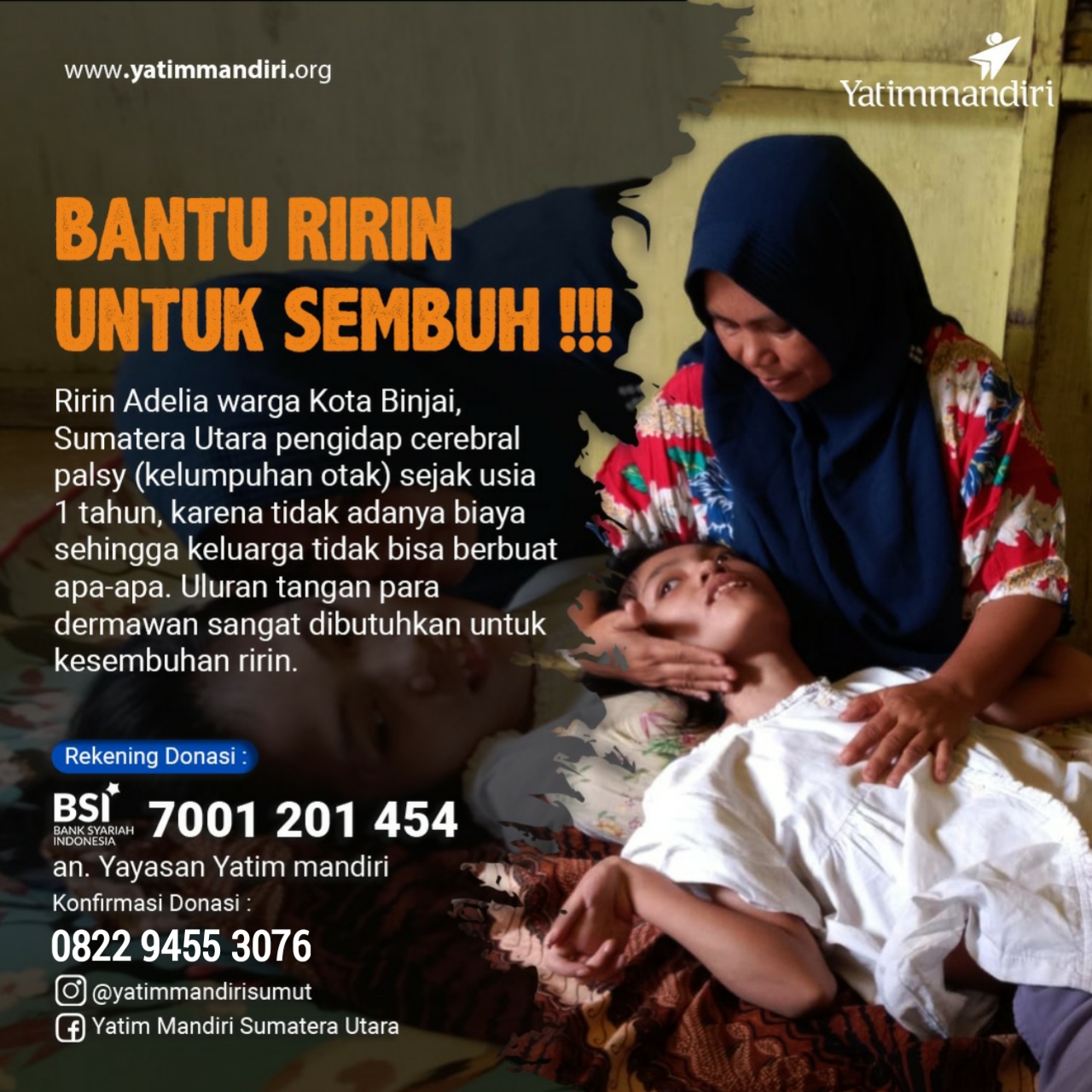 Luwuk.today, Ririn Adelia Pengidap Cerebral Palsy (Kelumpuhan Otak) Sejak Usia 1 Tahun, Warga Kota Binjai, Sumatera utara, harus menjalankan kehidupan yang sulit dalam masa tumbuh kembangnya, Ayah yang hanya bekerja sebagai buruh bangunan tidak bisa berbuat banyak dari cobaan ini, saat ini usia Ririn sudah 18 tahun dan hanya bisa berharap pada ibunya sebagai pengganti tubuh yang tidak bisa digunakan.