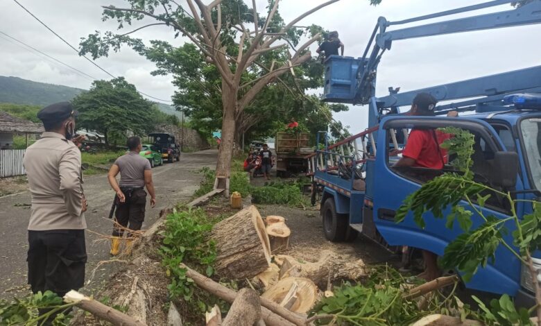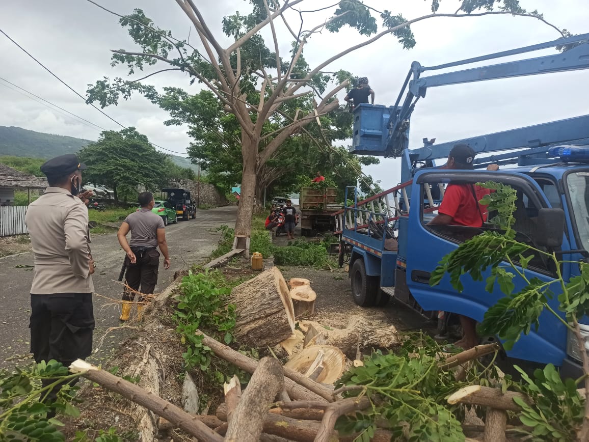 Bersama Dinas Lingkungan Hidup, Aparat Polsek Luwuk Evakuasi Pohon Tumbang Akibat Angin Kencang