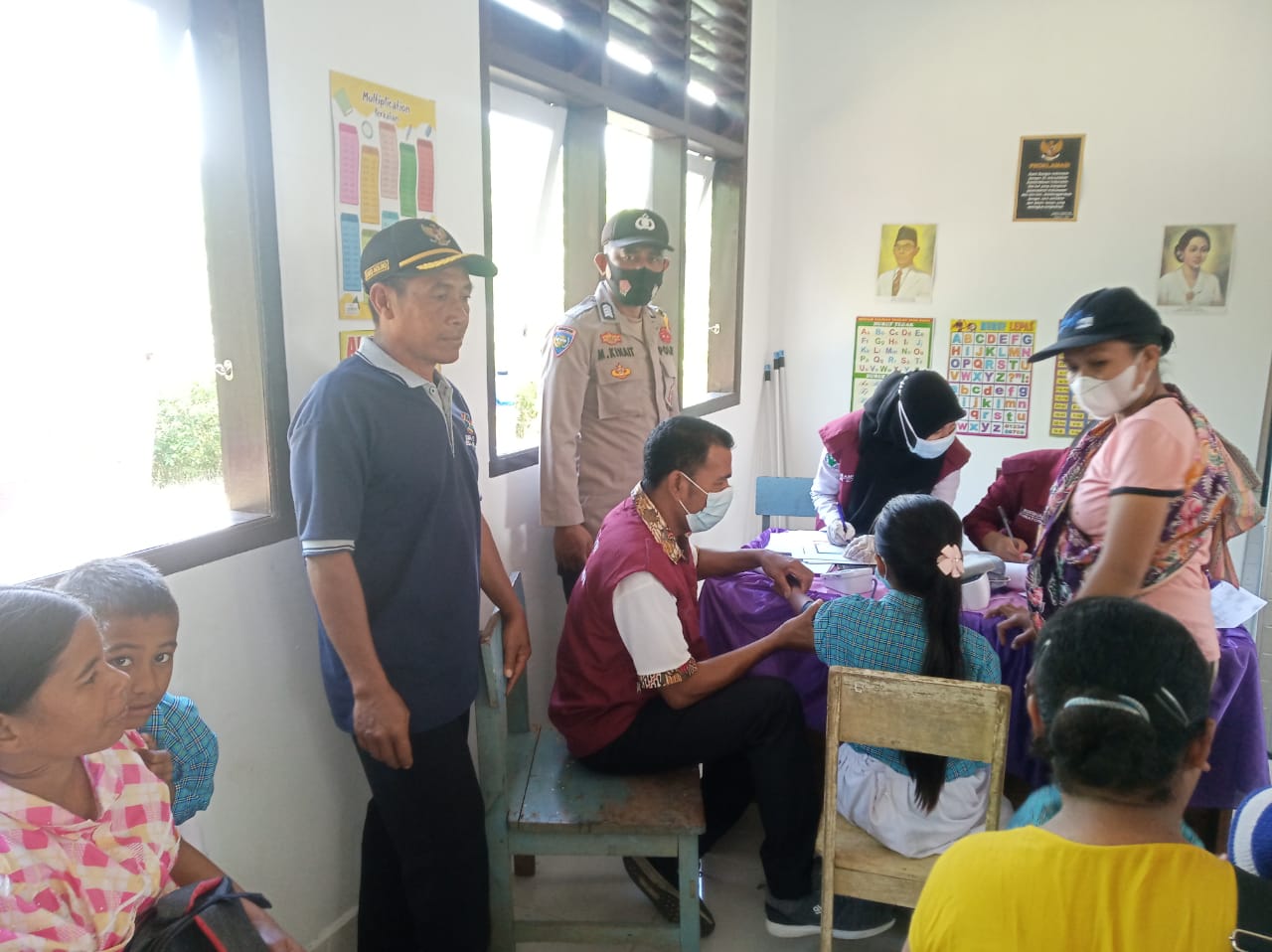 Luwuk.today, Bhabinkamtibmas Polsek Luwuk Bripka Martono Kinait melakukan monitoring dan pengamanan vaksinasi anak usia 6-11 tahun di SDN Banpres Bantayan 3, Desa Molino, Kecamatan Luwuk Timur, Kabupaten Banggai, Rabu (9/2/2022).