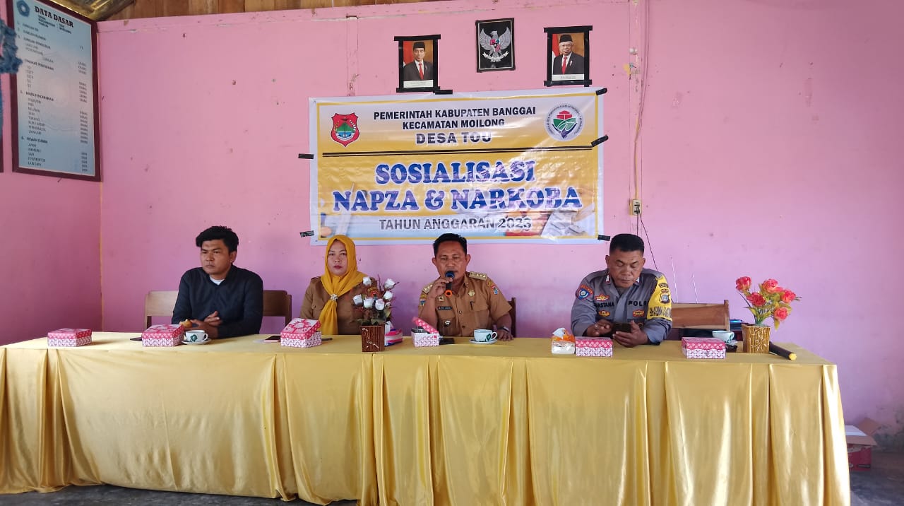 Luwuk.today, Dalam rangka menyelamatkan generasi muda, Bhabinkamtibmas Polsek Toili Bripka I Made Suastana melaksanakan Sosialisasi tentang Bahaya Penyalahgunaan Narkoba di hadapan 50 pemuda di Desa Tou, Kecamatan Moilong, Banggai, Rabu (30/8/2023).