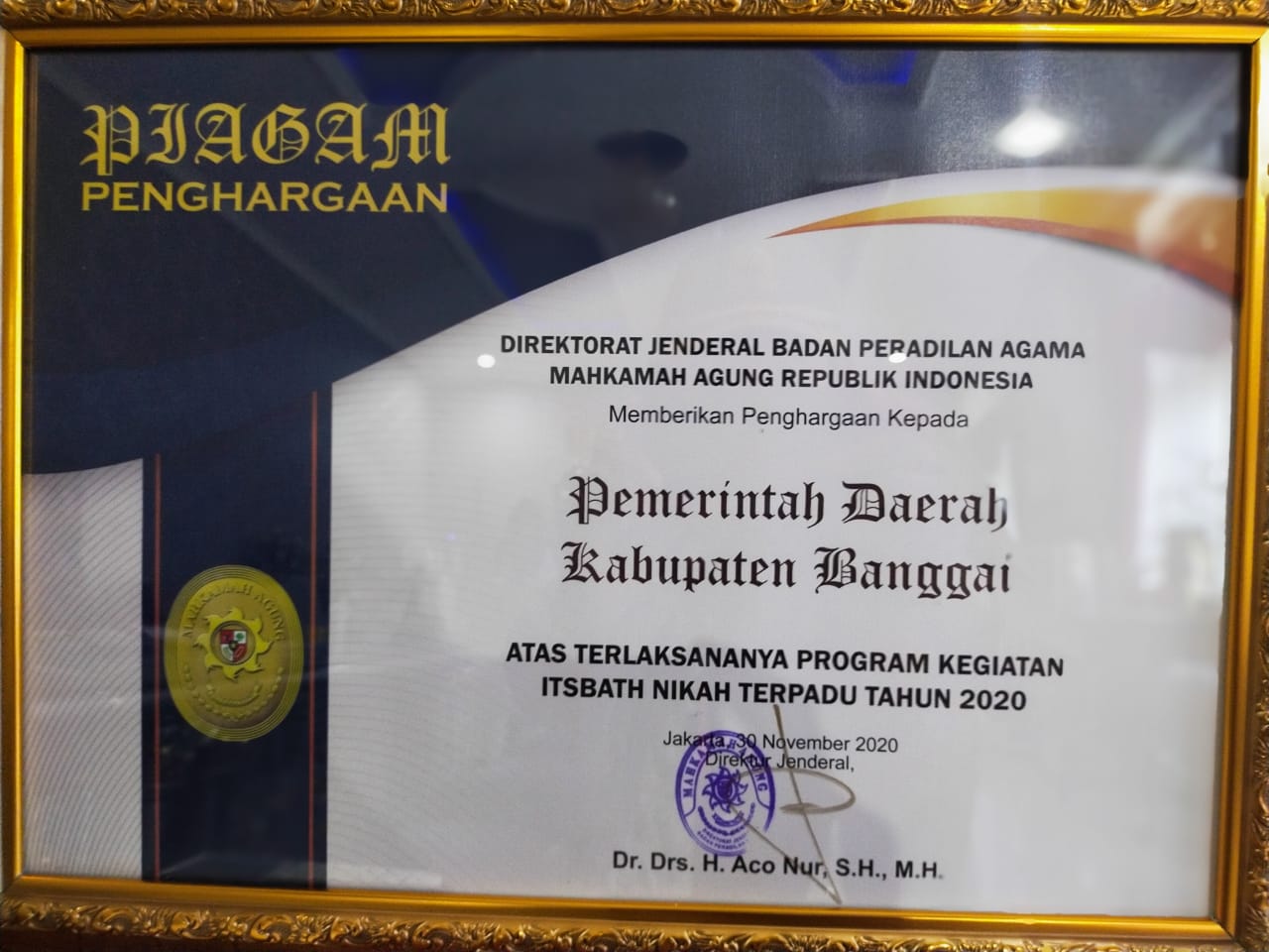 Piagam penghargaan diserahkan langsung oleh Ketua Pengadilan Agama Bapak Drs. Mustafa. MH kepada Bupati Banggai.