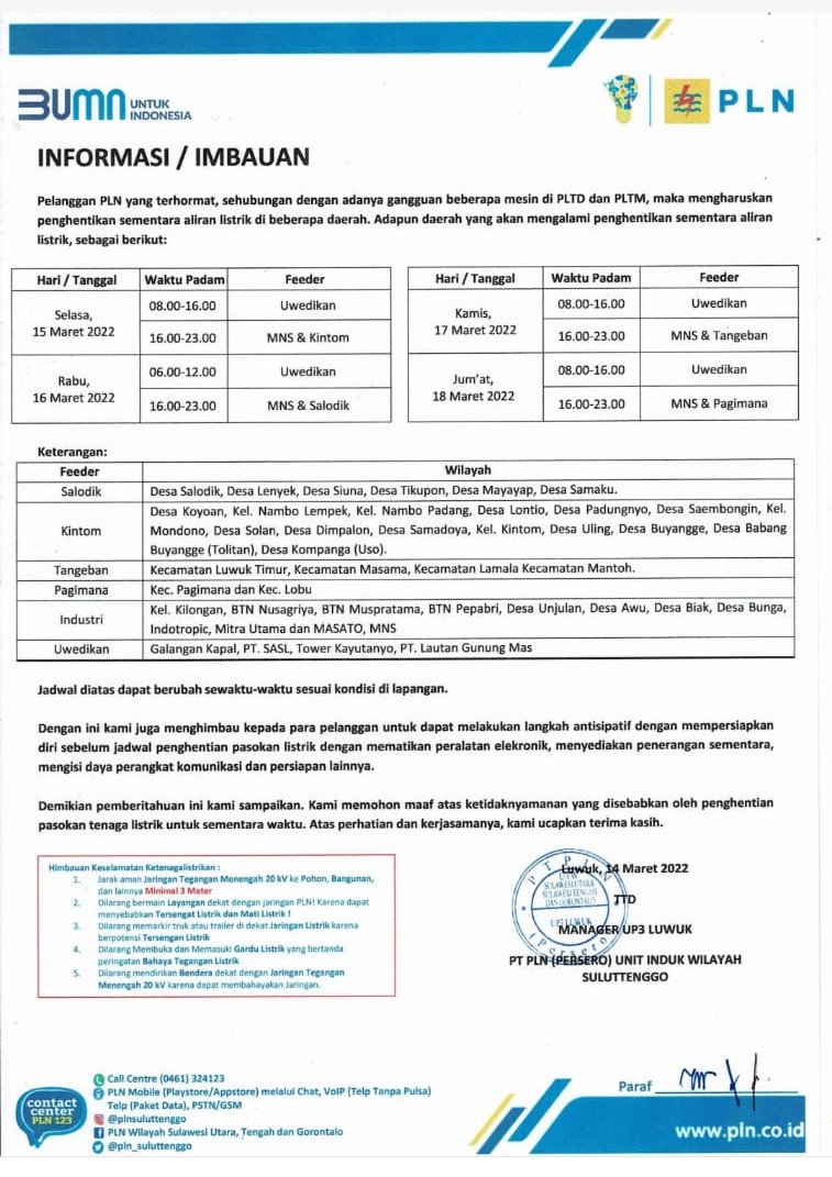 - Selasa, 15 Maret 2022, pukul 08.00-16.00 untuk feeder atau gardu distribusi wilayah Uwedikan, Sementara pada sore hari pukul 16.00-23.00 wilayah MNS dan Kintom.