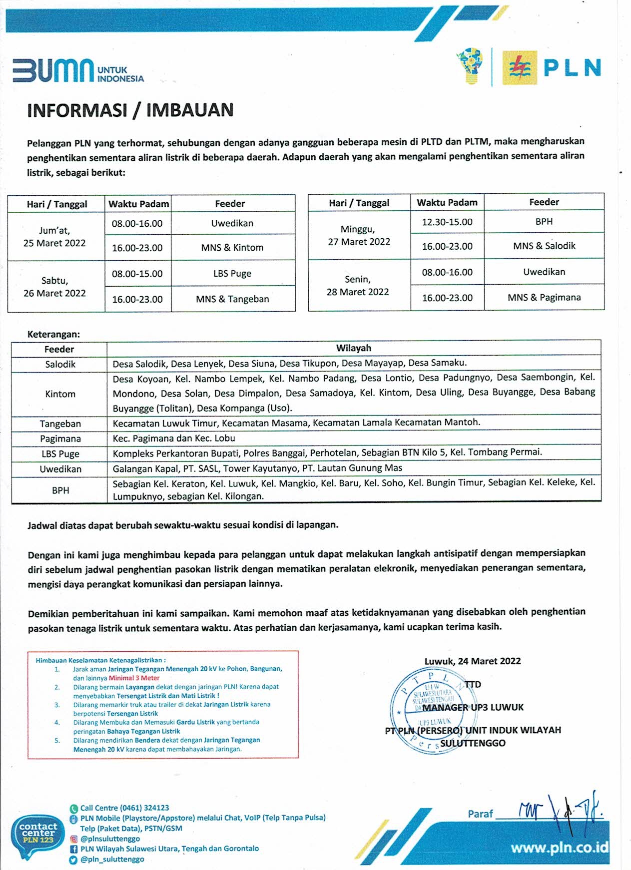 - Jum’at, 25 Maret 2022, pukul 08.00-16.00 untuk feeder atau gardu distribusi wilayah Uwedikan, Sementara pada sore hari pukul 16.00-23.00 wilayah MNS dan Kintom.
