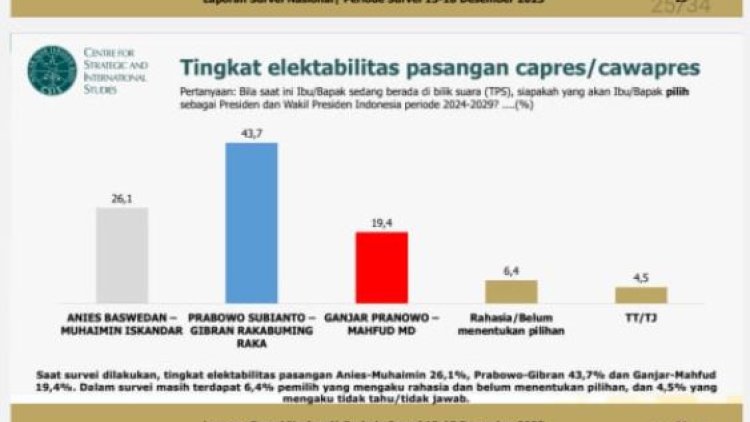 Hasil survei menunjukkan bahwa elektabilitas pasangan calon nomor urut 1 Anies Baswedan-Muhaimin Iskandar sebesar 26,1%, pasangan calon nomor urut 2 Prabowo Subianto-Gibran Rakabuming Raka sebesar 43,7% dan pasangan calon nomor urut 3 Ganjar Pranowo-Mahfud MD sebesar 19,4%. Sedangkan, yang belum menentukan pilihan atau tidak menjawab sebesar 10,9%. ***