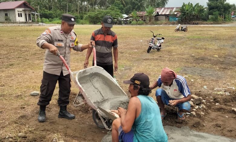 Gotong Jelang Peringatan HUT RI, Bhabinkamtibmas Toili Bersama Warga Gotong Royong Cor Tiang Bendera