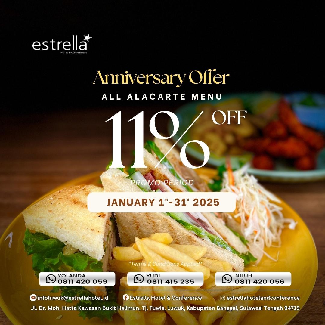 Sebagai bentuk apresiasi kepada tamu, Hotel Estrella memberikan diskon 11% untuk semua fasilitas, mulai dari layanan spa, kamar hotel, hingga menu ala carte di restoran. Promo ini berlaku sepanjang bulan Januari 2025, dari tanggal 1 hingga 31 Januari.