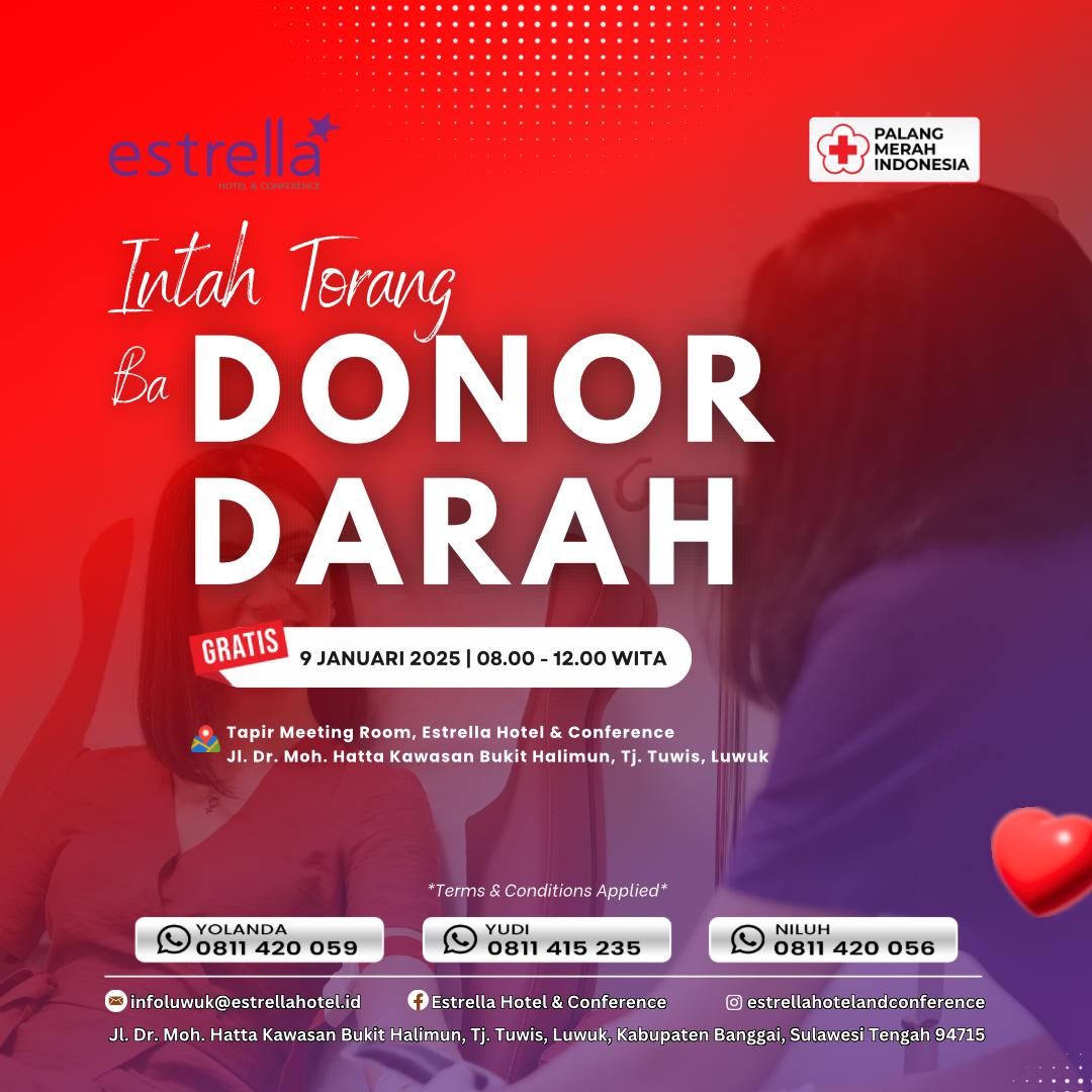 Sebagai bagian dari program tanggung jawab sosialnya, Hotel Estrella Luwuk menggelar acara donor darah yang terbuka untuk umum. Acara ini akan berlangsung pada 9 Januari 2025 di Tapir Meeting Room mulai pukul 08.00 WITA hingga selesai. Kegiatan ini bekerja sama dengan Palang Merah Indonesia (PMI) dan mengajak masyarakat untuk berpartisipasi membantu sesama.