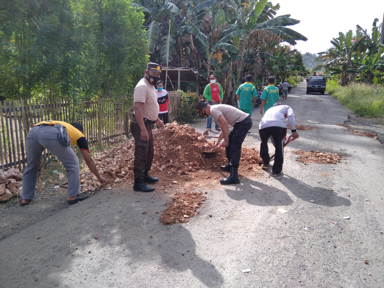 Luwuk.Today, Jajaran Polsek Lamala melaksanakan program Jumat Pagi Kota Bersih (Jumpa Kasih) dengan menimbun beberapa ruas jalan yang rusak di Desa Sirom, Kecamatan Mantoh, Jumat (28/1/2021).