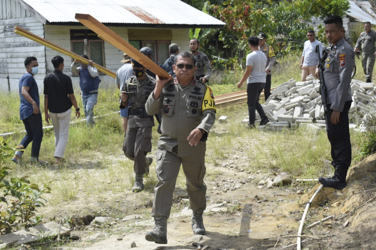 Tampak pati bintang dua di Polda Sulteng itu tidak canggung untuk mengangkat balok kayu dan bersama anggota bergotong royong secara estafet memindahkan material bangunan.