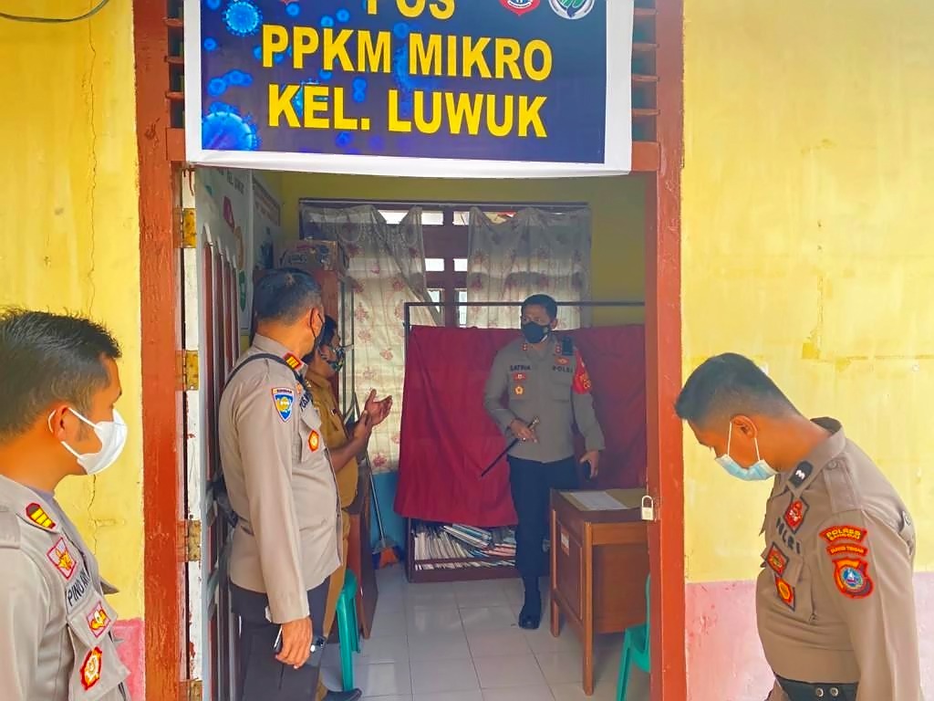 Luwuk.today, Kapolres Banggai AKBP Satria Adrie Vibrianto SIK, MH, didampingi Kapolsek Luwuk AKP Pino Ary SH, SIK, MH, kembali meninjau langsung sejumlah Posko Pemberlakukan Pembatasan Kegiatan Masyarakat (PPKM) skala Mikro di wilayah Kecamatan Luwuk, Kabupaten Banggai, Senin (12/7/2021).