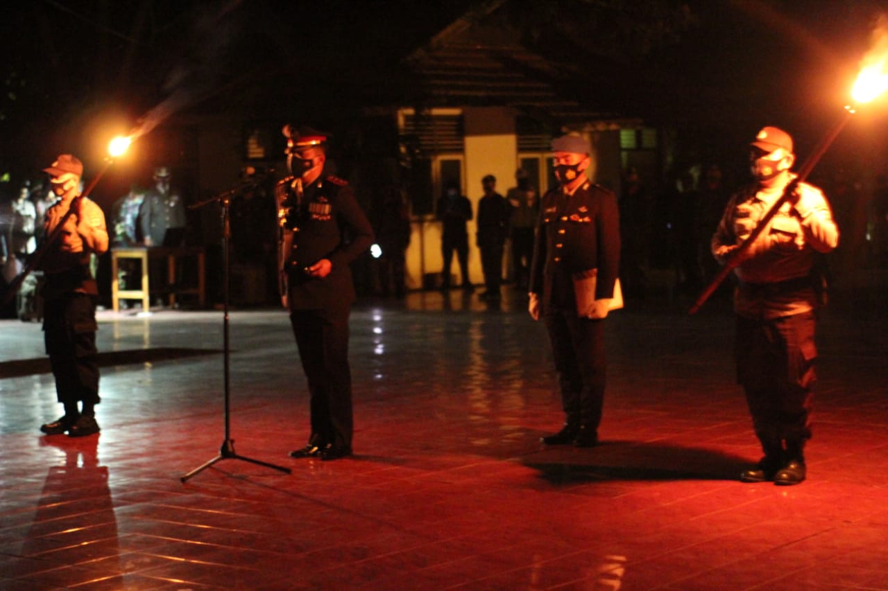 Luwuk.today, Kapolres Banggai AKBP Satria Adrie Vibrianto SIK, MH, memimpil apel kehormatan dan renungan suci di Taman Makam Pahlawan (TMP) Kelurahan Tanjung Tuis, Kecamatan Luwuk, Kabupaten Banggai, Senin (16/8/2021) malam.