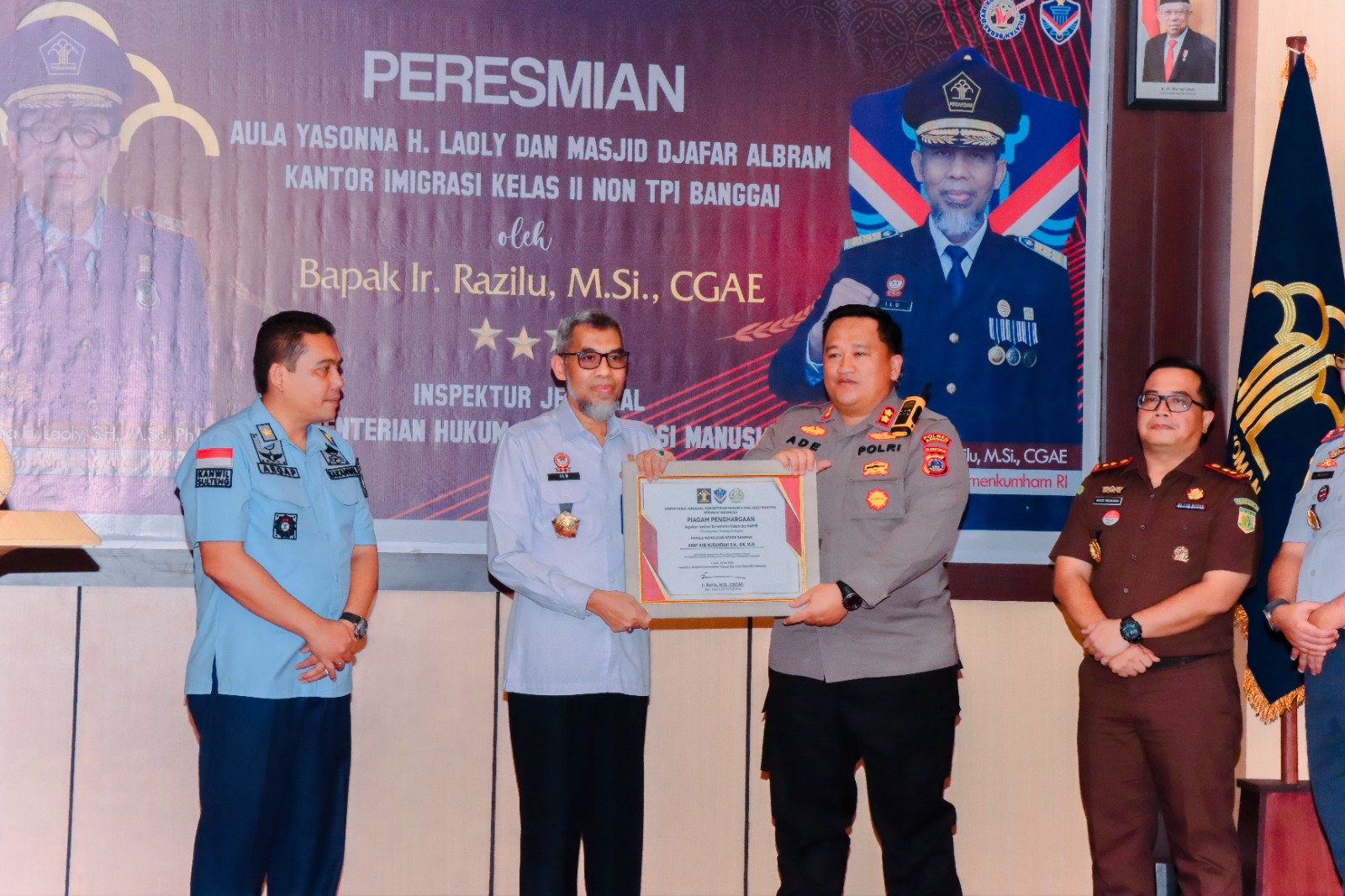 Piagam penghargaan iti diterima langsung orang pertama di Polres Banggai ini usai peresmian Gedung Aula Yasonna H. Laloly di Kantor Imigrasi Kelas II NON-TPI Banggai, Kecamatan Luwuk Selatan, Kabupaten Banggai.