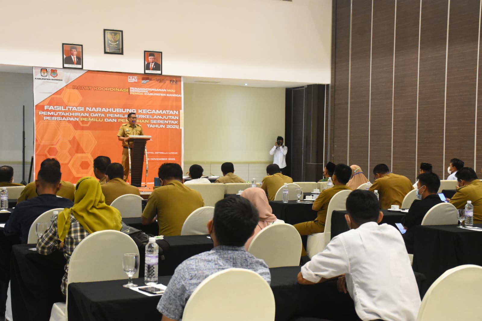Luwuk.today, Mewakili Bupati Banggai, Asisten Perekonomian dan Pembangunan Drs. H. Alfian Djibran, M.Si membuka secara resmi kegiatan Rapat Koordinasi dan Penandatanganan MoU Fasilitasi Narahubung Kecamatan Pemutakhiran DaftarPemilih Berkelanjutan (PDPB) Persiapan Pemilu dan Pemilihan Serentak Tahun 2024, yang di gelar Komisi Pemilihan Umum (KPU) Kabupaten Banggai, bertempat di Hotel Estrella Luwuk, ruang Maleo 2, Bukit Halimun, Senin (22/11/2021).