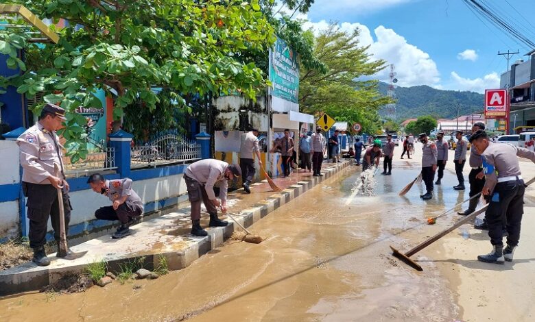 Jalan Protokol, Sekolah, Rumah penduduk dan fasilitas lain dibersihkan personil Polres Tolitoli dengan menggunakan peralatan seadanya dibantu Mobil Watercanon untuk menyemprot sisa-sisa lumpur,