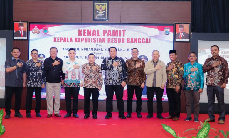 Luwuk.today, Banggai – Kegiatan kenal pamit antara Kapolres Banggai lama, AKBP Ade Nuramdani SH, SIK, MM, kepada pejabat baru, AKBP Putu Hendra Binangkari SIK, berlangsung meriah di Aula Hotel Estrella Luwuk, Kecamatan Luwuk Selatan, Kamis (18/7/2024) malam.