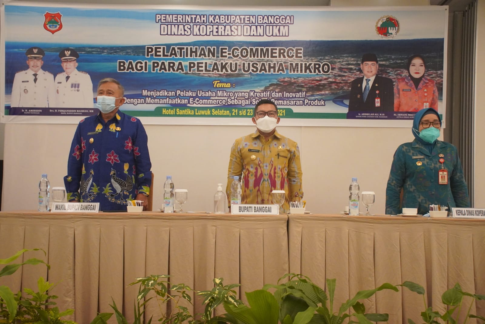 Luwuk.today, Bupati Banggai H. Amirudin membuka secara resmi kegiatan Pelatihan E-Commerce Bagi Para Pelaku Usaha Mikro, yang digelar Dinas Koperasi Kab. Banggai, bertempat di ballrom Hotel Santika Luwuk, yang dilaksanakan selama 3 hari mulai (21–23 Oktober 2021).