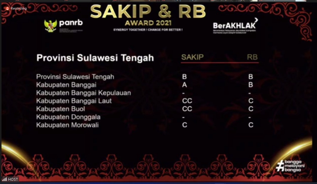 Pemkab Banggai Raih Peringkat SAKIP A dan Nilai Reformasi Birokrasi B Pada SAKIP RB Award 2021