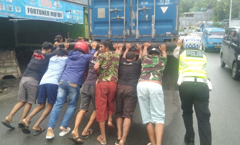 Personil Satlantas Polres Banggai dan Warga Bersatu Bantu Dorong Tronton Mogok di Jalan
