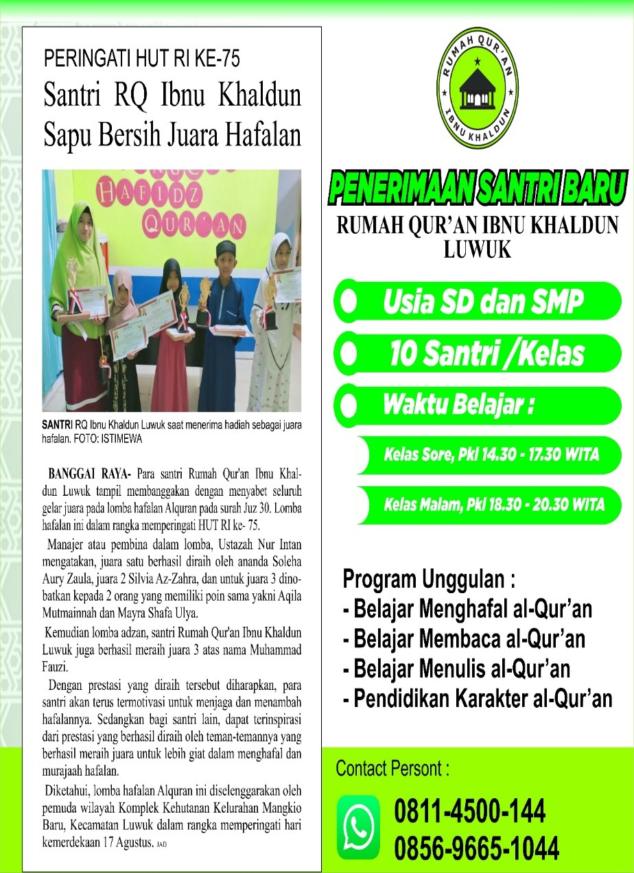 Sementara di RQ Ibnu Khaldun Luwuk yang mengajarkan anak usia SD-SMP pada sore hari juga menunjukkan hasil yang sangat memuaskan. Terbaru, santri angkatan pertama berhasil menghafalkan juz 29 (surah al-Mulk-al-Mursalat) hanya dalam waktu empat bulan saja dengan pencapaian nilai rata-rata 97 persen pada saat ujian pada pekan ke 2 Januari 2021 belum lama ini.