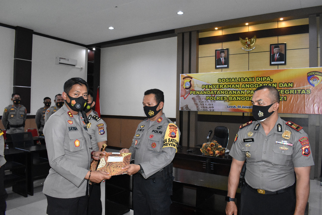 Luwuk Today, Luwuk – Polres Banggai menggelar sosialisasi Daftar Isian Pelaksanaan Anggaran (DIPA), penyerahan anggaran dan penandatanganan pakta integritas tahun 2021 di aula Rupatama Mapolres Banggai, Senin (4/1/2021).
