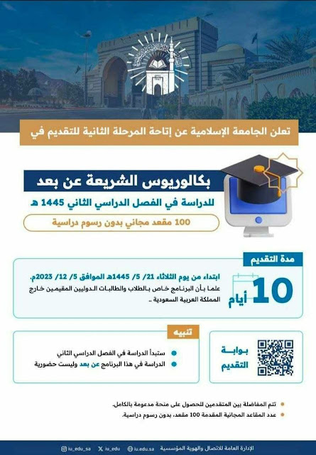 Luwuk.today, Pada Selasa, 5 Desember 2023, Universitas Islam Madinah di Arab Saudi mengumumkan pembukaan pendaftaran Program Pembelajaran Jarak Jauh (PJJ/Online/Daring) jenjang Sarjana Jurusan Ilmu Syariah untuk calon Mahasiswa Internasional 2024 selama bentang waktu 10 hari.