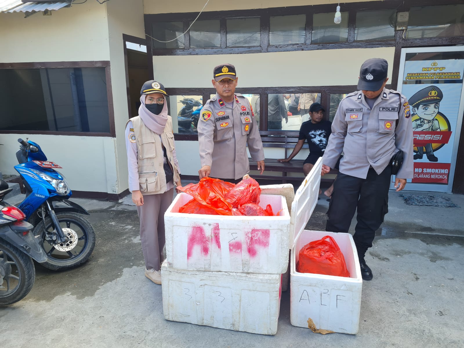Luwuk.today, Subsektor KP3 Pelabuhan Polsek Luwuk mendampingi Karantina Pertanian Kelas II Palu wilayah Luwuk melakukan tindakan penolakan terhadap daging sapi sebanyak 90 kg dari Kabupaten Sanana, Maluku melaui Pelabuhan Lalong Luwuk, Selasa (11/4/2023).