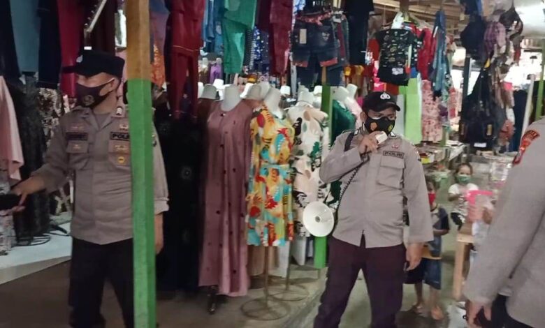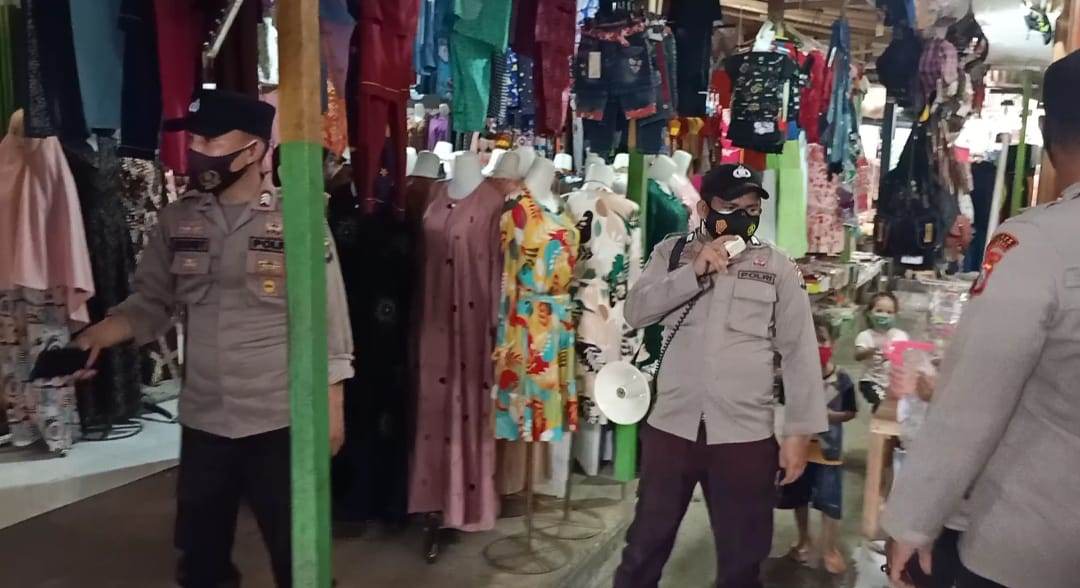 Luwuk.today, Polisi terus mengingatkan tentang pelaksanaan Pemberlakuan Pembatasan Kegiatan Masyarakat (PPKM) skala mikro kepada para pedagang dan pengunjung di Pasar Sentral, Kecamatan Bunta, Kamis (22/7/2021).