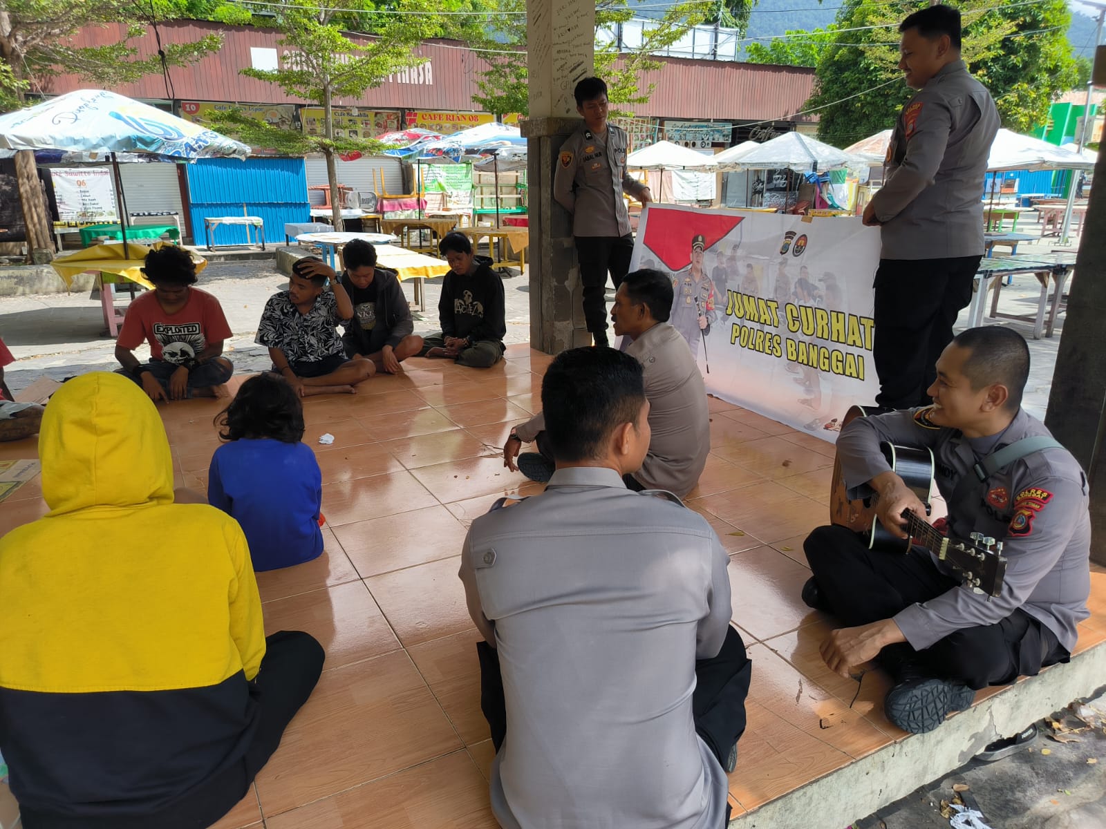 Jum’at Curhat Kamtibmas dilaksanakan di Ruang Terbuka Hijau (RTH) Teluk Lalong Kelurahan Karaton, Luwuk bermaksud untuk memberikan himbauan kepada kumpulan anak punk dan anak jalanan yang sebagian besar putus sekolah.
