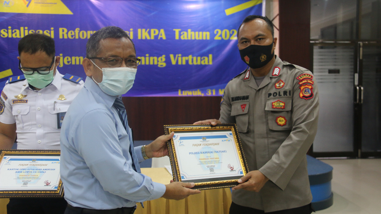 Luwuk.today, Polres Banggai menerima piagam penghargaan dari Kepala Kantor Pelayanan Pembendaharaan Negara (KPPN) Tipe A2 Luwuk, Abu Said Maha, Rabu (31/3/2021).