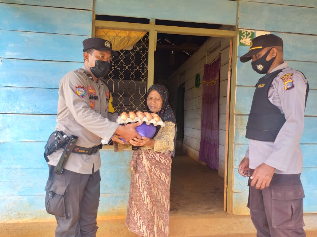 Luwuk.today, Personel Polsek Nuhon menyalurkan bantuan sosial (bansos) Polri Peduli kepada warga yang terdampak pandemi Covid-19 di Desa Sumber Agung, Kecamatan Nuhon, Kabupaten Banggai, Sealsa (28/9/2021).