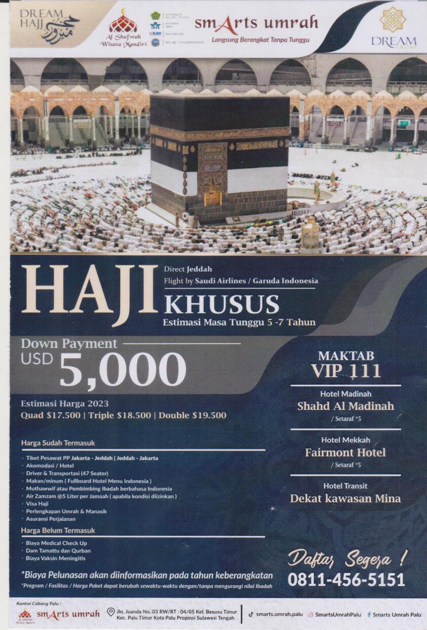 Mempersembahkan paket Haji Khusus dari Dream Hajj, dimana kesempatan emas menunaikan ibadah di Tanah Suci kini terbuka lebar dengan masa tunggu hanya 5-7 tahun. Dengan down payment mulai dari USD 5,000 atau sekitar Rp. 78,6 Juta (dengan kurs dollar saat artikel ini dibuat Rp. 15.720), langkah Anda menuju Baitullah akan dipenuhi kemudahan dan kenyamanan.