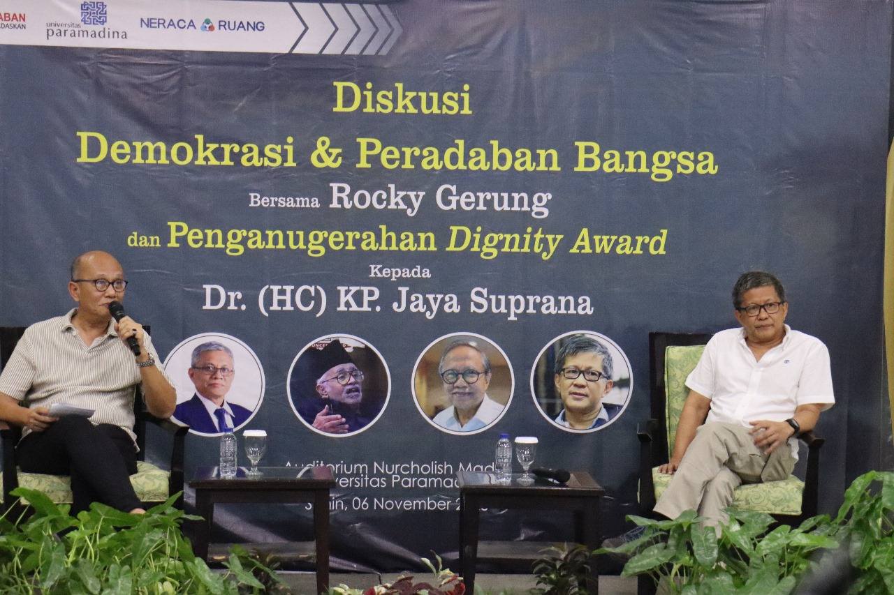 Demikian disampaikan Rocky Gerung dalam Diskusi Demokrasi dan Peradaban dan Penganugerahan Dignity Award yang diselenggarakan atas kerjasama Institut Peradaban dan Universitas Paramadina di Auditorium Nurcholish Madjid Universitas Paramadina, Senin (6/11/2023).