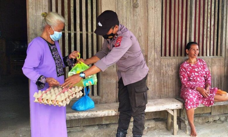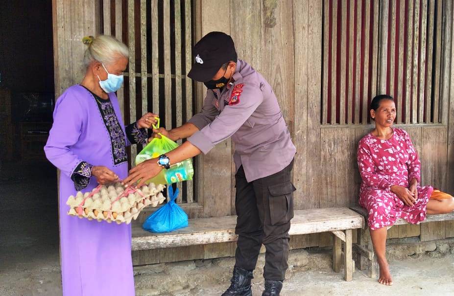 Dalam kesempatan itu Aipda Mustafa menyerahkan bantuan berupa paket sembako kepada salah satu warga binaannya yang telah lanjut usia (lansia) Painem (80).