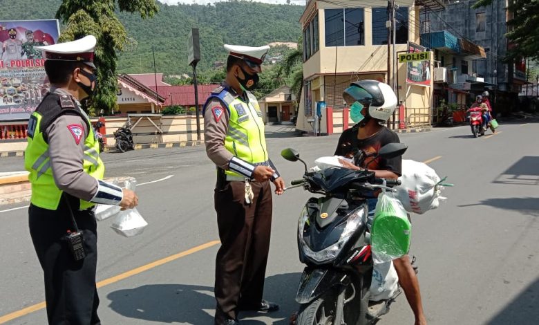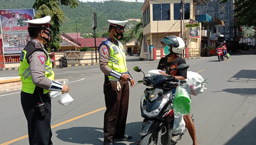 Sambil Bagi Nasi Kotak, Satlantas Polres Banggai Lakukan Sosialisasi Disiplin Prokes dan Tertib Lalin
