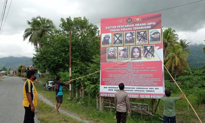 Luwuk.today, Poso – Upaya pencarian sisa daftar pencarian orang (DPO) teroris Poso, Satgas Madago Raya kembali pasang baliho DPO teroris Poso,