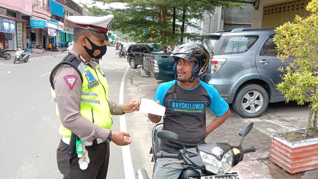 Satlantas Polres Banggai Bagikan Brosur Imbauan Tertib Berlalu Lintas dan Prokes