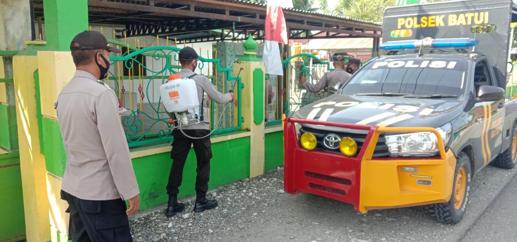 Sebelum Salat Jumat, Polsek Batui Lakukan Penyemprotan Disinfektan di Sejumlah Masjid