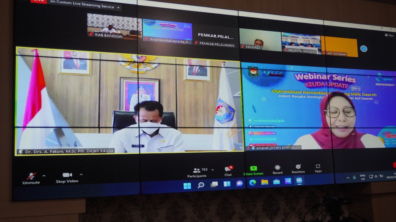 Pelaksana Harian (Plh.) Dirjen Keuda Kemendagri Republik Indonesia, Dr. Drs Agus Fatoni, M.Si memberikan arahan di awal webinar. Menurut penjelasannya, upaya percepatan penyelesaian masalah terkait pemanfaatan aset daerah yang dapat dilakukan adalah, yang pertama menyusun dan menetapkan peraturan daerah mengenai pengelolaan barang milik daerah (BMD). Kedua, pensertifikatan tanah. Selanjutnya, sosialisasi pengelolaan aset daerah khususnya tata cara pemanfaatan. Keempat, melakukan inventarisasi BMD. Kelima, melakukan pemanfaatan terhadap BMD yang idle, dan yang terakhir penertiban aset daerah.